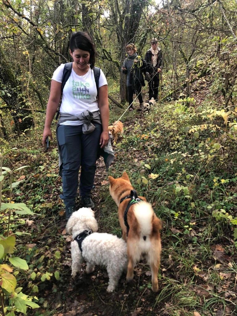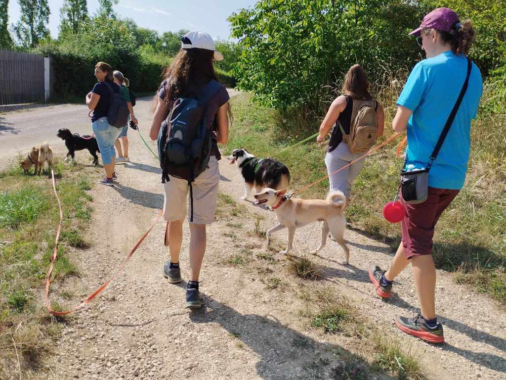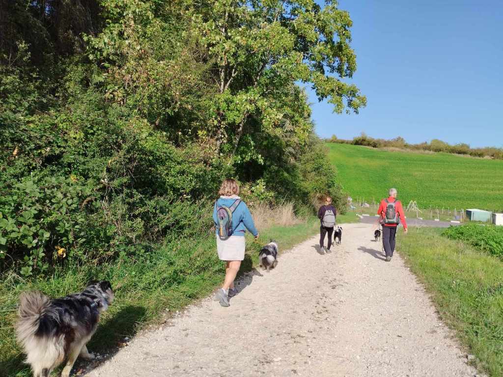 La promenade se déroule en longe ou en libre (en fonction des chiens et de l’environnement). Durant la balade, j’observe les réactions entre les chiens, leurs comportements et nous échangeons à ce sujet.