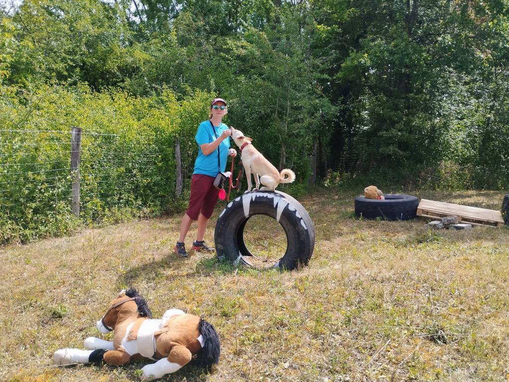 Elle est suivie d’un parcours avec différents agréés (tunnel, sauts, passer sur une bâche, dans des pneus, sur un toboggan, etc.) permettant aux chiens d’apprendre à être à l’aise sur tous types de surfaces.