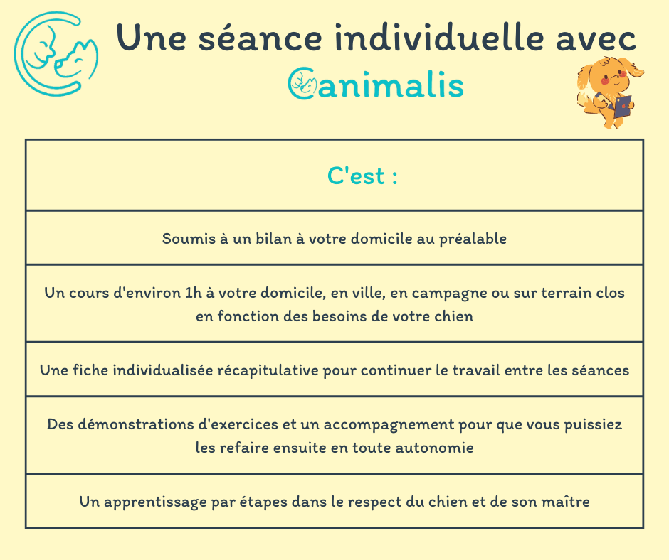 Après le bilan, nous pouvons envisager des séances individuelles d’environ 1h qui peuvent se dérouler à votre domicile dans un premier temps puis en extérieur autour de chez vous, en campagne ou en ville en fonction des axes à travailler avec votre chien. Elles peuvent aussi avoir lieu sur un terrain clos situé à Vaux (Auxerre). Une fiche vous sera remise en fin de séance afin que vous puissiez reproduire ce que nous avons vu ensemble. Avant chaque séance il est important de dépenser votre chien (sans trop le fatiguer) pour qu’il soit dans de bonnes conditions d’apprentissage. En cas de difficulté ou pour toute question, vous pourrez me contacter par téléphone, Messenger ou mail entre 2 séances.