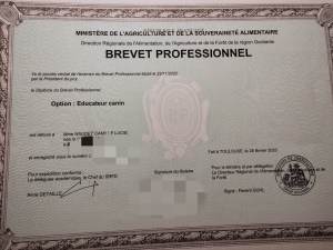 Organiser des démonstrations, journées découvertes et entraînements d’obéjump m’a beaucoup plu et m’a donné envie de devenir éducatrice canine. C’est pourquoi, j’ai souhaité me perfectionner en effectuant une formation qualifiante de 9 mois : le brevet professionnel (BP) d’éducateur canin délivré par le Ministère de l’Agriculture.